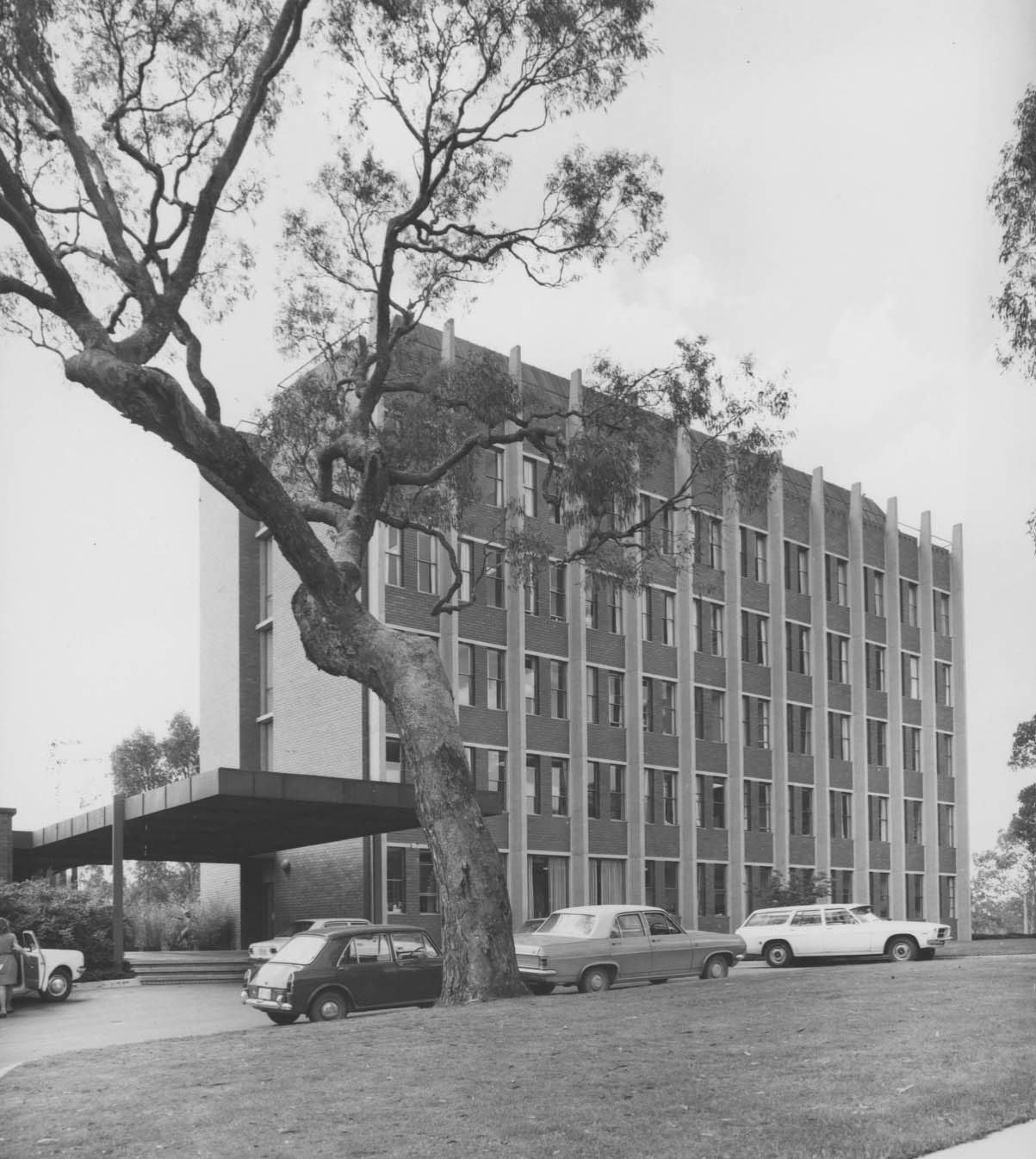 The complex of Chancelry Buildings serves as the administrative centre of the ANU. In 1963 construction commenced on the Chancelry Tower. Prior to this, the university’s administrative services were based in what became known as the Old Administration Area to the southwest of the current Chancelry near the current College of Law. The Tower would become the centre of a new administrative complex that would also include three wings. The buildings were designed by Roy Simpson of Yuncken Freeman Architects and construction was completed in four stages between 1963 and 1996. The Chancelry Tower was opened on 10 September 1964.