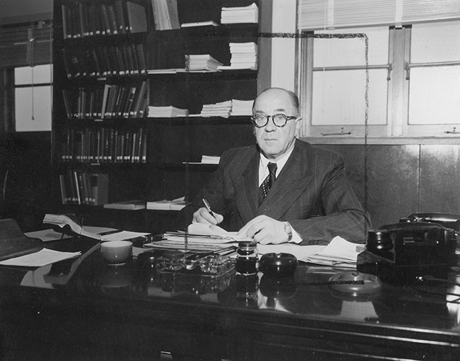 Robert Gumley Osborne (1903 - 1970) played a key role in organising the Easter Conference. He was in his mid-40s when, on 30 July 1947, he was appointed as the first Registrar at the ANU. This was far more than a limited administrative post. With both law and arts degrees from the University of Tasmania, Osborne was a former parliamentary draftsman, Acting Solicitor-General in Tasmania, and chief legal officer in the Commonwealth Department for War Organisation of Industry. Calling on this depth of experience, Osborne assisted with drafting the University's statutes and developing and interpreting academic policy. As yet there was no Bursar, and so a wide range of financial and organisational matters fell to him and his one or two secretarial assistants.