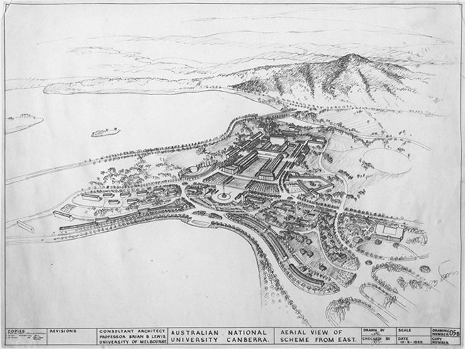 In 1947, the government recognised that planning the university site was an urgent priority. Professor Brian Bannatyne Lewis (1906 - 1991), who occupied the foundation chair of Architecture at the University of Melbourne was appointed as the consultant site and building architect. He attended the Easter Conference holding a bundle of plans. He had just returned from Europe where he had been studying university buildings, especially those designed for scientific research.